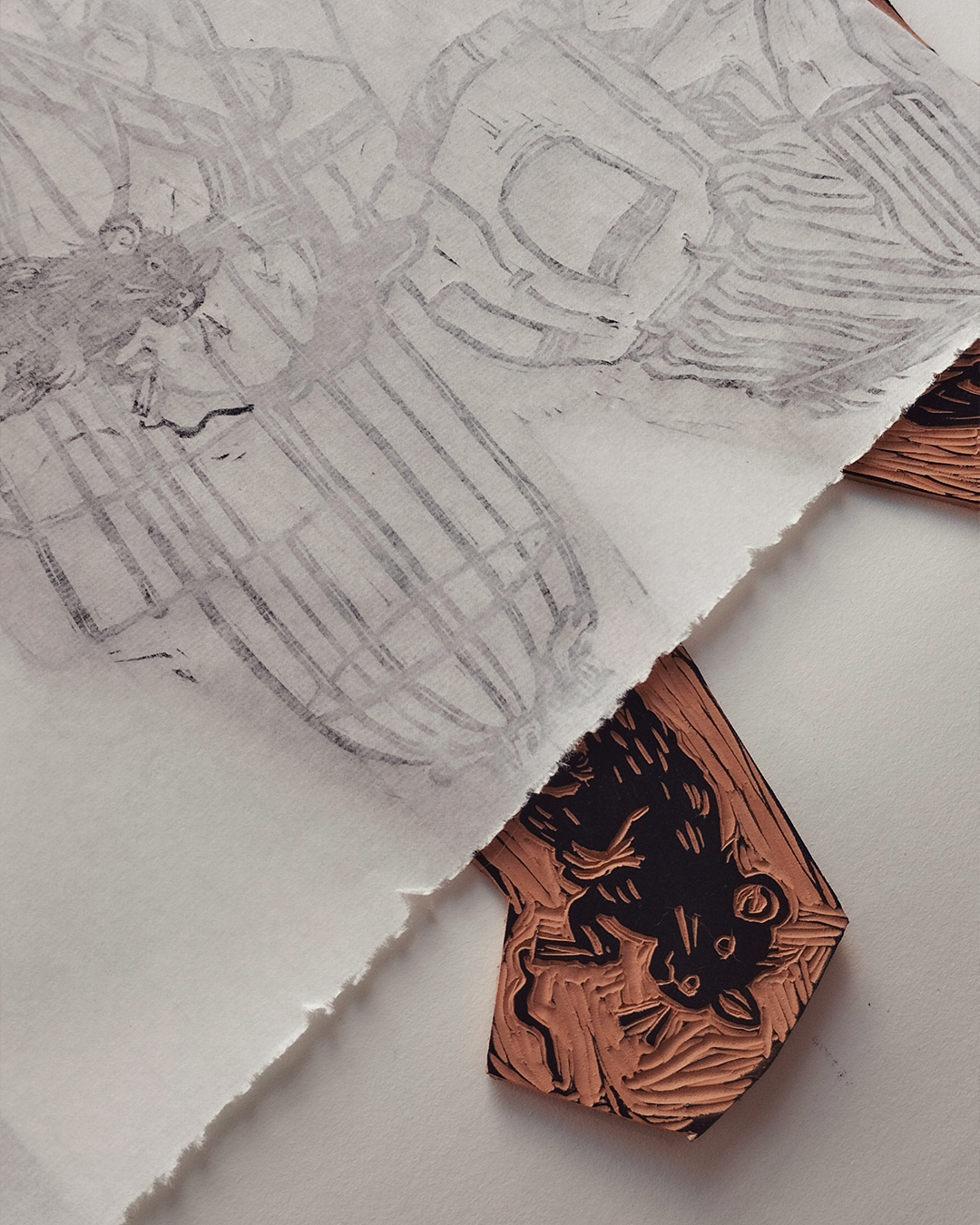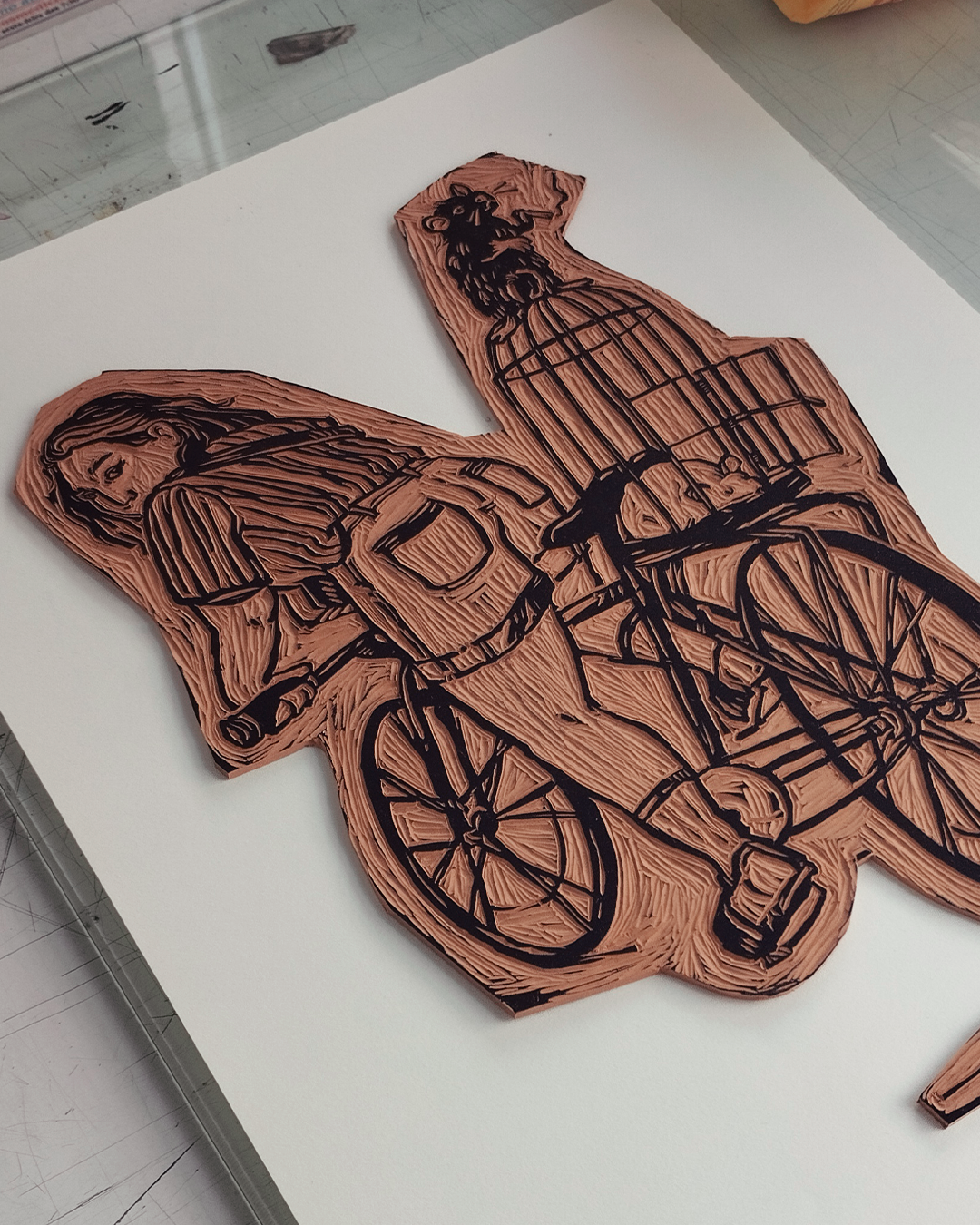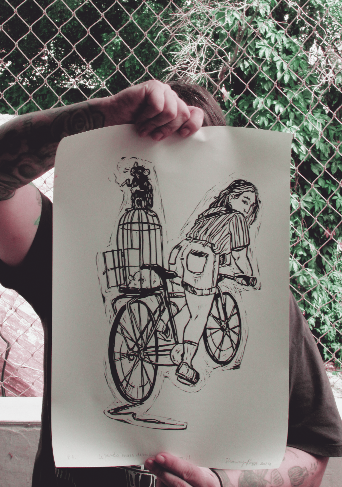 Projeto pessoal com ilustração digital e experimentação em linoleogravura